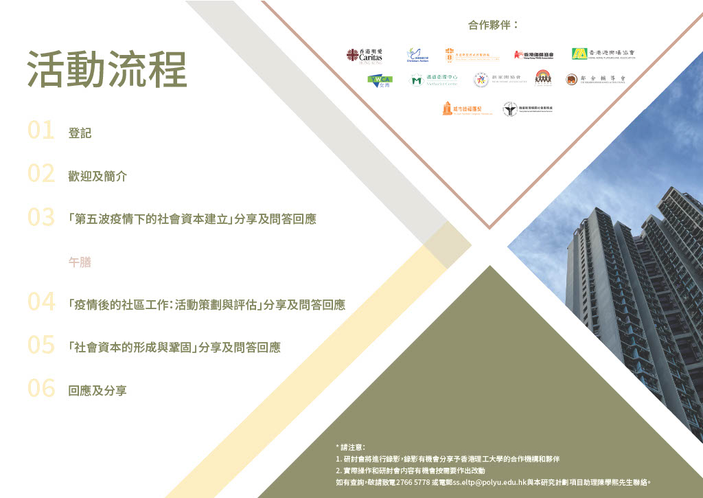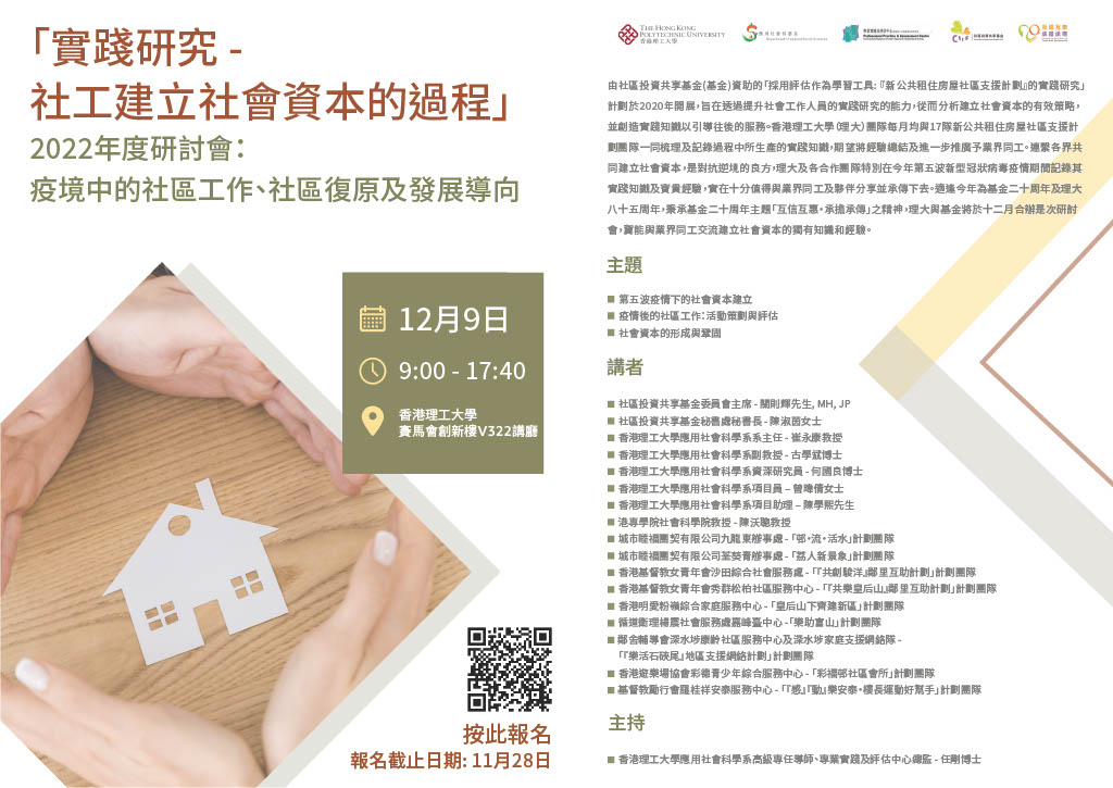 由社區投資共享基金(基金)資助的「採用評估作為學習工具: 『新公共租住房屋社區支援計劃』的實踐研究」計劃於2020年開展,旨在透過提升社會工作人員的實踐研究的能力,從而分析建立社會資本的有效策略,並創造實踐知識以引導往後的服務。香港理工大學(理大)團隊每月均與17隊新公共租住房屋社區支援計劃團隊一同梳理及記錄過程中所生產的實踐知識,期望將經驗總結及進一步推廣予業界同工。連繫各界共同建立社會資本,是對抗逆境的良方,理大及各合作團隊特別在今年第五波新型冠狀病毒疫情期間記錄其實踐知識及寶貴經驗,實在十分值得與業界同工及夥伴分享並承傳下去。適逢今年為基金二十周年及理大八十五周年,秉承基金二十周年主題「互信互惠‧承擔承傳」之精神,理大與基金將於十二月合辦是次研討會,冀能與業界同工交流建立社會資本的獨有知識和經驗。